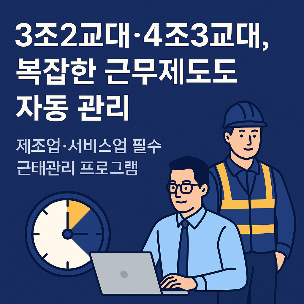 서론: HR 담당자의 현실적인 고민제조업·자동차 부품업체 등에서는 생산라인을 24시간 가동하기 위해 교대근무제를 필수적으로 운영합니다.특히 3조2교대, 4조3교대와 같은 복잡한 근무 형태는근무조 편성휴무(비번) 관리특근 및 연장근무 수당 계산등에서 인사팀의 업무를 크게 늘립니다.엑셀이나 수기로는 한계가 있어 실수와 누락이 반복되곤 하죠.그렇다면, 이런 복잡한 교대근무제도 근태관리 프로그램으로 자동화할 수 있을까요? 본론: 교대근무제의 특징과 관리 포인트 3조2교대, 4조3교대란?3조2교대→ 인원을 **3개 조로 나누어 하루 2교대(주간/야간)**로 근무하는 방식.한 조는 주간 근무, 한 조는 야간 근무, 나머지 한 조는 **휴무(비번)**를 가집니다.즉, 직원들이 주간 → 야간 → 휴무 순환으로 돌아..